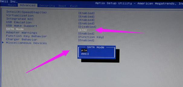 戴爾示例1 當按F2鍵進入bios后,找到并用鍵盤“← →”左右方向鍵移動到“Advanced-SATA Mode”,然后按Enter回車鍵,再按鍵盤的“↑↓”上下方向鍵選擇ATA。此次操作是將硬盤模式修改為ATA模式,為的是防止在安裝過程中出現藍屏。