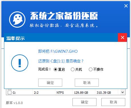 u盤示例3 彈出程序將執行還原操作提醒框,勾選完成后重啟復選框,點擊確定