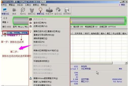 分區硬盤示例3 當鼠標放在需要分區的硬盤上面,鼠標點右鍵會出現下面的選擇菜單
