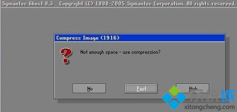 8、接下來Norton Ghost會詢問你是否需要壓縮鏡像文件,“No”表示不做任何壓縮;“Fast”的意思是進行小比例壓縮但是備份工作的執行速度較快;“High”是采用較高的壓縮比但是備份速度相對較慢。一般都是選擇“High”,雖然速度稍慢,但鏡像文件所占用的硬盤空間會大大降低(實際也不會慢多少),恢復時速度很快;