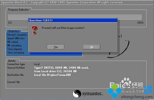 9、這一切準備工作做完后,Ghost就會問你是否進行操作,當然選“yes”了,按回車后,開始為你制作鏡像文件了。備份速度與CPU主頻和內容容量有很大的關系,一般來說10分鐘以內都可以完成。等進度條走到100%,就表示備份制做完畢了。可以直接按機箱的重啟按鈕或ctrl+alt+del,而不用退出ghost或dos系統。