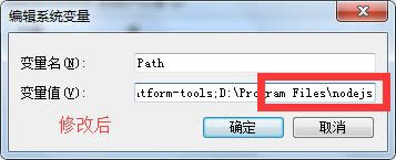 10、在【編輯系統變量】界面將【變量值】里面的:D:\Program Files\nodejs\ 最后的斜杠去掉,修改為D:\Program Files\nodejs 然后依次點擊【確定】按鈕保存設置;
