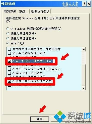 3、對比一下最佳外觀和最佳性能就可以知道,華麗的外表都需要系統資源作為支撐的(淡進淡出、動畫效果等)。那么是否有兩全其美的效果呢?有,自定義:開始→控制面板→系統→高級→性能→視覺效果→先選定 調整為最佳性能→應用(此時自動設置到自定義)→再點選中 在窗口和按鈕上試用視覺效果、在桌面上為圖標標簽使用陰影 這兩項→確定。