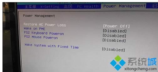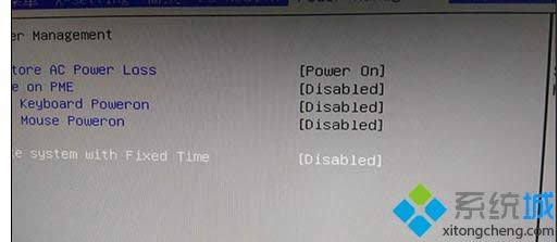 4、用鍵盤上的上下左右鍵控制選項,選擇POWER MANAGEMENT主選項,在主選項中選擇第一項,這一項控制是否支持來電啟動,默認為關閉;